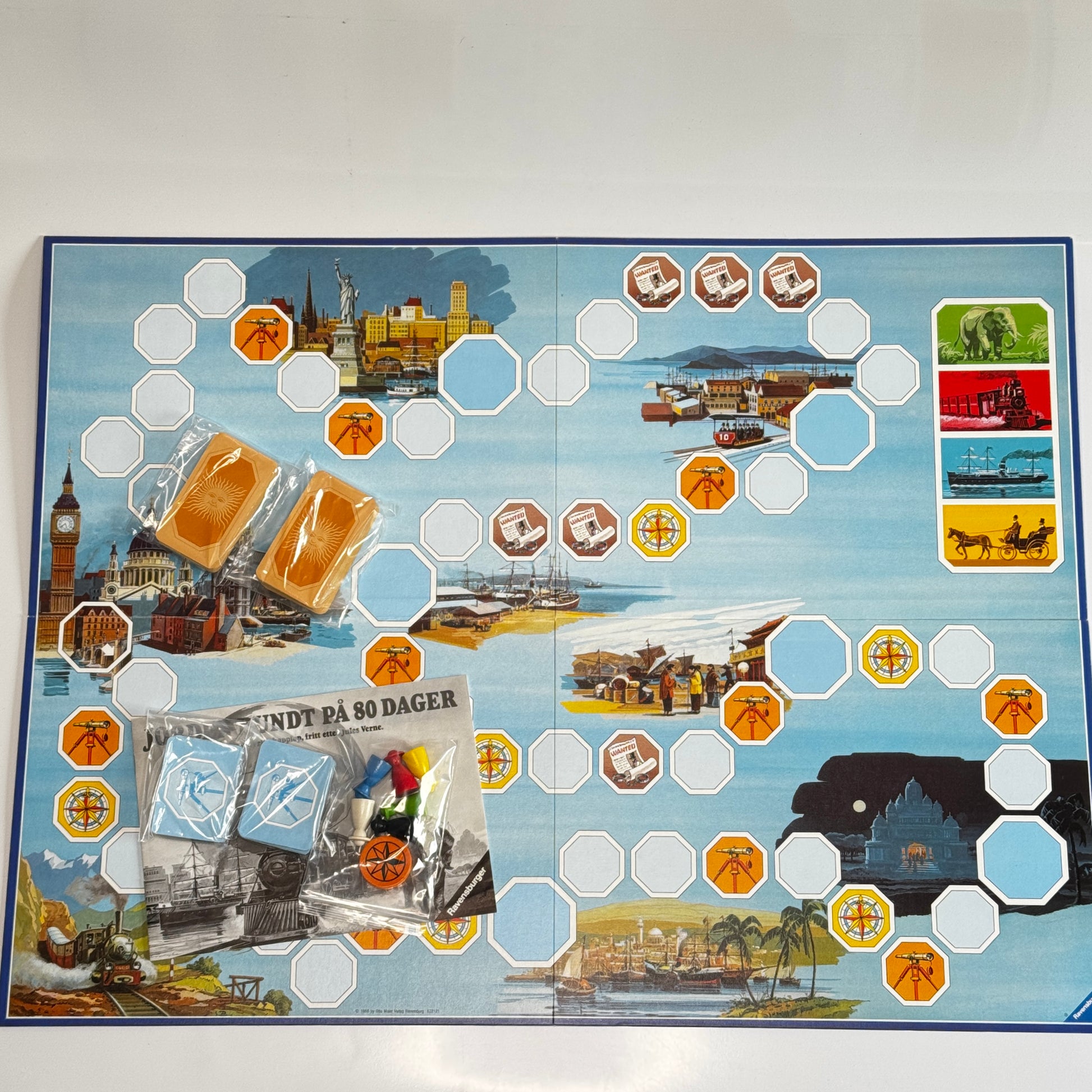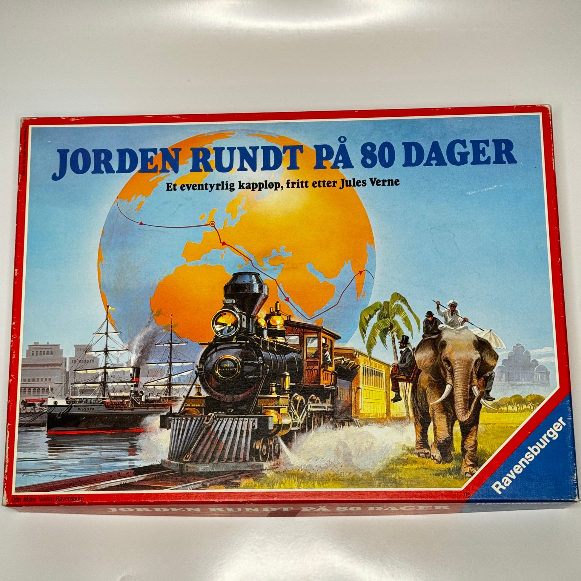 Stikkord: brettspill - Ravensburger - klassiker - Jorden rundt på 80 dager - Jules Verne - familie - 80-talls spill - vintage