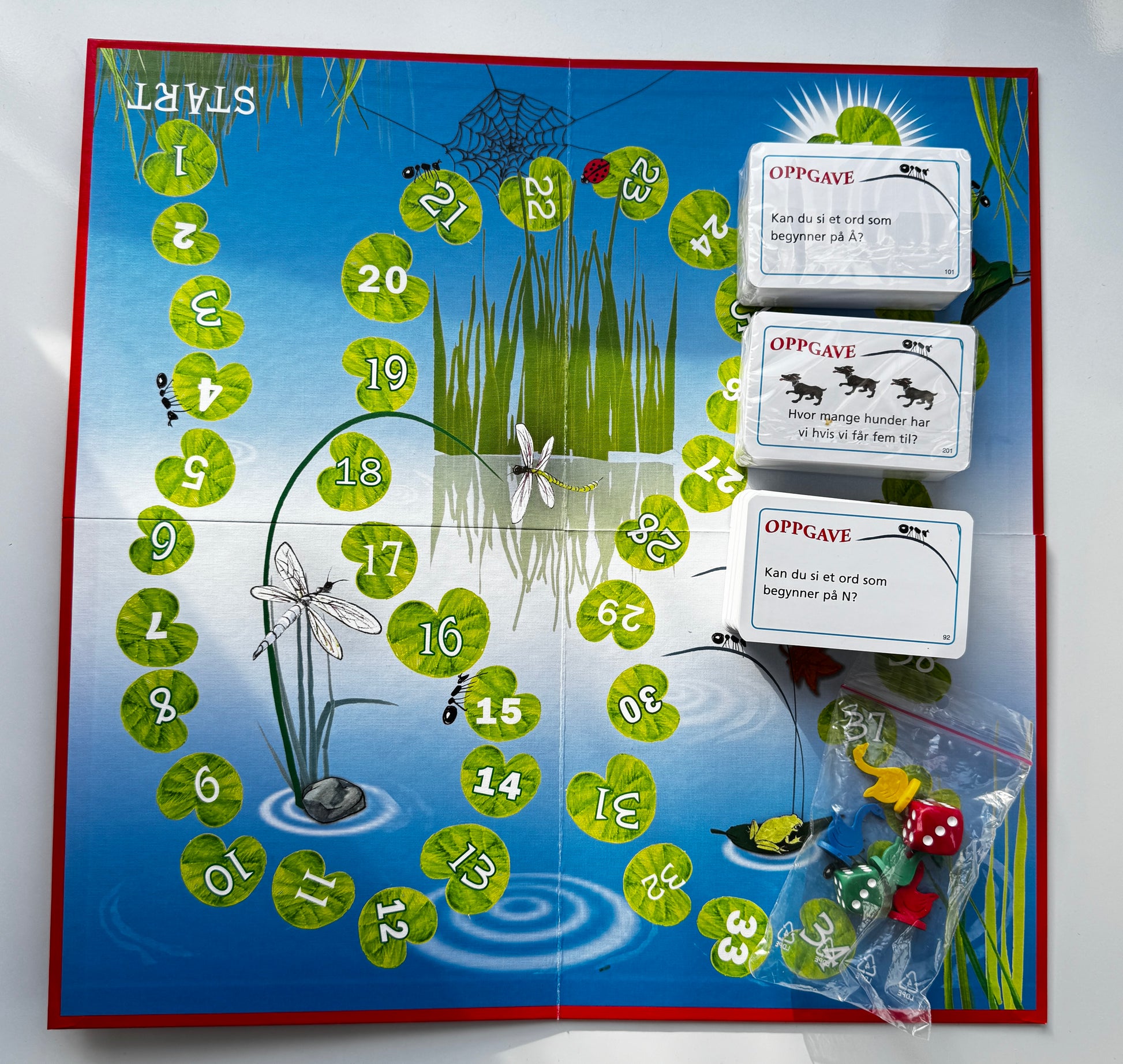 • Innhold: Spillebrett, oppgavekort, terning, brikker og regler