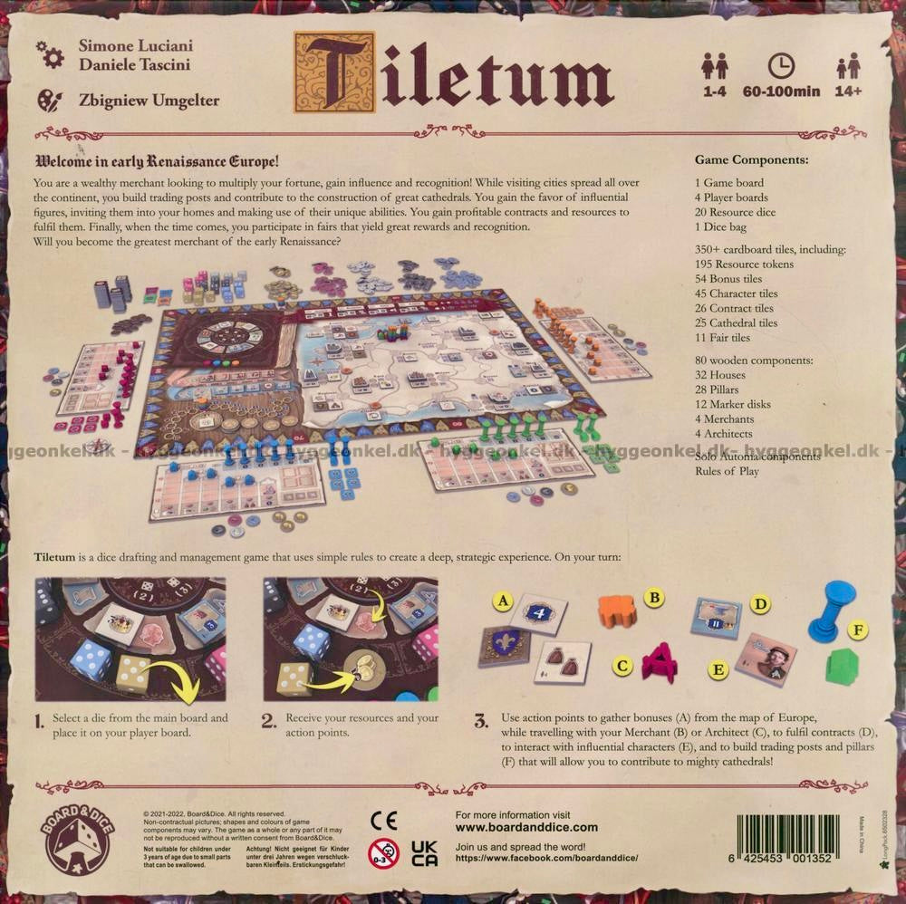 I Tiletum tar du rollen som en velstående handelsmann i renessansens Europa. Du reiser fra by til by for å samle ressurser, bygge katedraler, vinne kongens gunst og delta i messer. Spillet er en blanding av ressursforvaltning, taktisk planlegging og smarte valg – der hver runde krever god vurdering av terninger og handlinger.