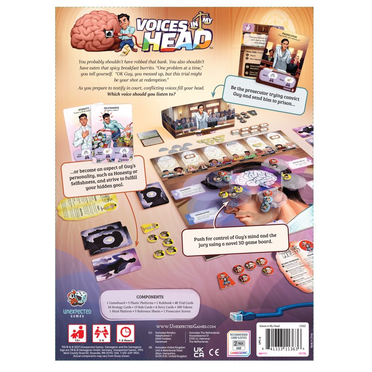 Hva skjer egentlig i hodet på en tilsynelatende vanlig fyr? I Voices In My Head får én spiller rollen som den tiltalte Guy, mens de andre spillerne tar kontroll over ulike deler av hans personlighet – som fornuft, impuls, minne og redsel – i et intenst rettsdrama med taktiske valg og skjulte agendaer.